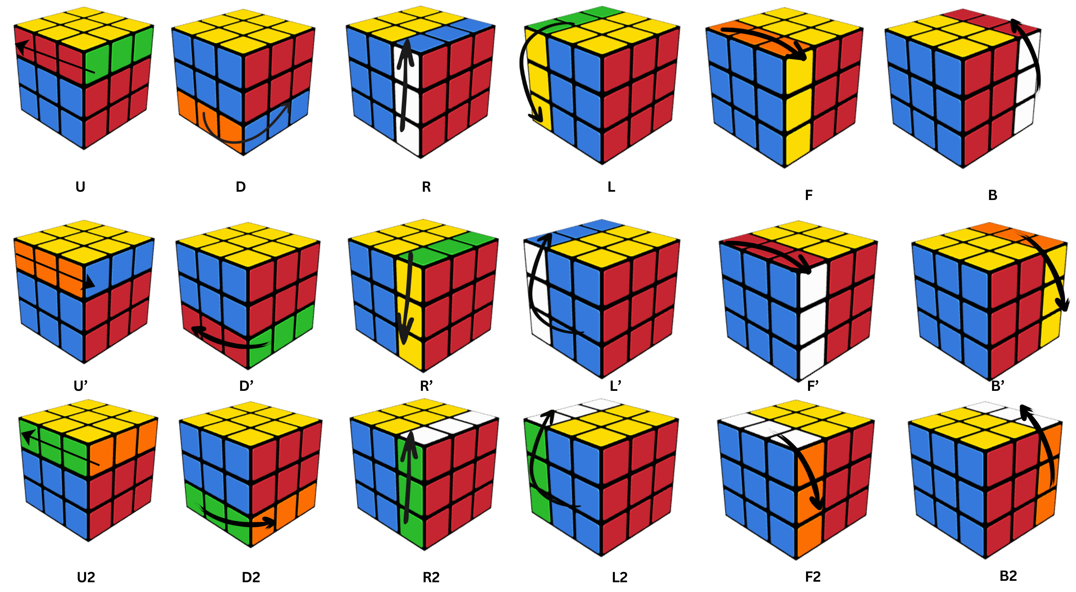 A single letter represents a 90-degree clockwise turn of that face. An apostrophe (e.g., U’) indicates a 90-degree counterclockwise turn, and a number 2 (e.g., U2) indicates a 180-degree turn.